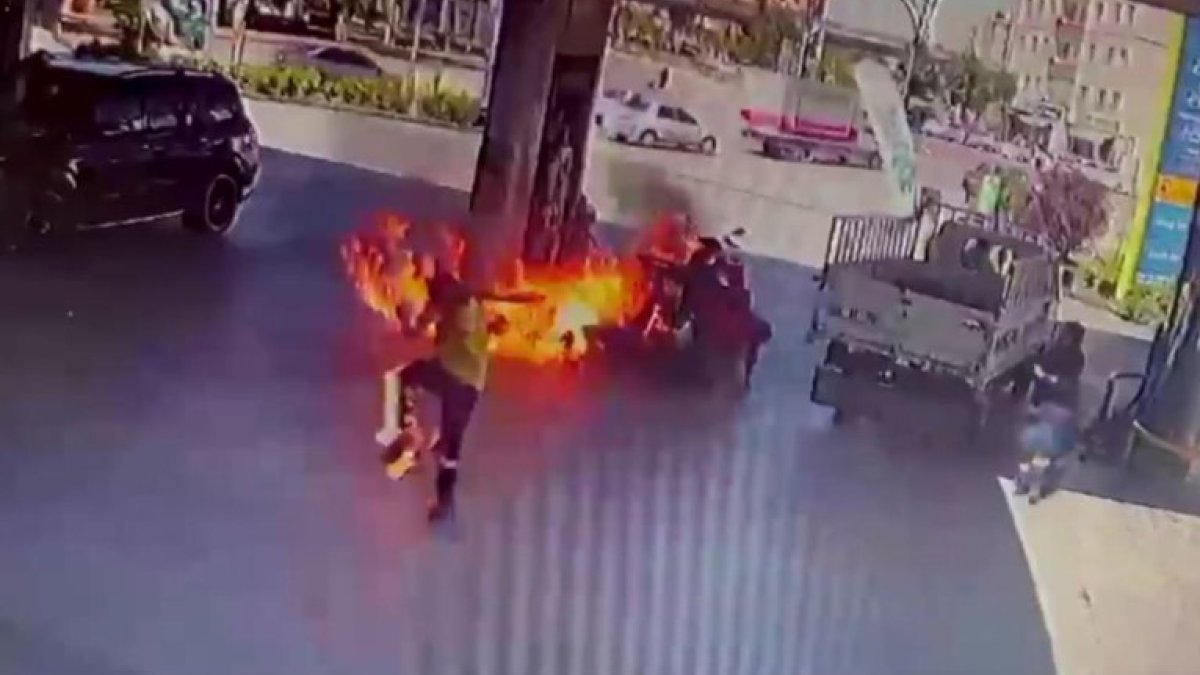 Ateşlemenin ardından önce ATV sonra da benzin pompası alevler içinde kaldı. Saniyeler içinde alev topuna dönen ATV ve pompadaki alevler pompa görevlisini ve ATV sürücüsünü de alev topuna çevirdi. Alevler içinde kalan ATV sürücüsü yanarak pompadan kaçmaya çalışırken tüm bu yaşananlar akaryakıt istasyonunun güvenlik kamerasına yansıdı.
